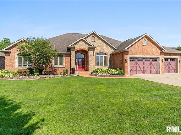 This outstanding all-brick and stone ranch-style home exudes exceptional curb appeal and comes with a three-car garage featuring custom garage doors. The expansive backyard is securely enclosed by a black iron fence and showcases a stunning covered outdoor patio that overlooks a remarkable in-ground pool, complete with a power cover, all while enjoying breathtaking views of Panther Creek Golf Course. Additionally, there is another covered and screened patio that offers the same spectacular views. Upon entering through the front door, you are immediately welcomed by an impressive living room that boasts elegant cherry wood flooring, a large stone gas fireplace, and soaring ceilings. This space seamlessly transitions into the open kitchen and dining area. The kitchen is expertly designed with a spacious breakfast bar and newly installed quartz countertops, complemented by modern appliances, including a refrigerator, wall oven, and stovetop. A private office, conveniently located just off the kitchen, features ample windows that highlight the picturesque views of the backyard pool and golf course. The primary bedroom is impressively spacious, adorned with high ceilings, crown molding, and a generous walk-in closet. The adjoining primary bathroom is a luxury retreat, featuring double vanities, a large tub, and a slate walk-in shower. Descending the open staircase leads to an exceptional wet bar and a vast family room enhanced by slate flooring and elevated ceilings.