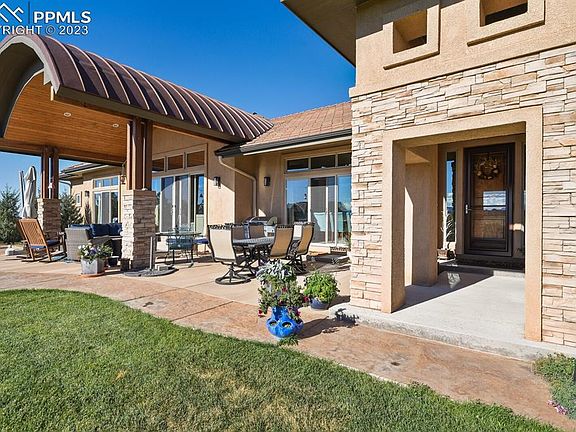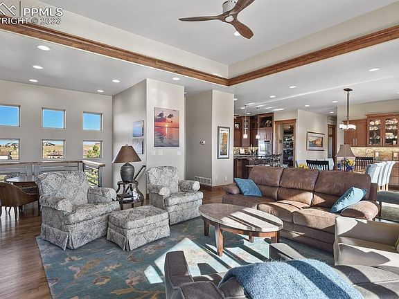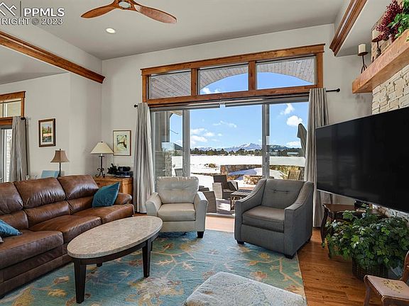 Welcome to this stunning, expertly crafted true custom home on 2.5 acres in Settlers Ranch. As the builder's private residence, high quality materials and attention to detail are evident. Designed to take advantage of MAJESTIC MOUNTAIN VIEWS of Pikes Peak and the Front Range from the office, dining room, great room and owners suite. Tall ceilings, well detailed windows, sliding patio doors let the light in and emphasize the indoor/outdoor spaces. You will enjoy entertaining with the open floor plan, a kitchen that includes Dacor double ovens, 5 burner gas cooktop, TWO dishwashers, cherry cabinets. Slab granite counters, bar top and vanities throughout the home. A large walk in pantry with provisions for another refrigerator and a built in desk. The dining area includes a built in breakfront. Tall wood baseboards, alder wood doors with detailed multi piece header, wood casing around windows and doors, hickory plank floors, iron railing are custom features not found in many homes today. Floor to ceiling stone wall in the great room with horizontal fireplace, custom mantel and crown mold. The owner's suite has a gas fireplace, walks out to the patio, well appointed bathroom that includes a soaking tub, large double shower and walk in closet. To complete the main level there is another bedroom with a deck and has a private bath, and a main level office. The lower level has a large family room with wet bar and wine cellar, 3 sided fireplace, 2 more bedrooms, one with a private bath and both with walk in closets as well as another office. An unfinished storage area next to the furnace room includes 2 high efficiency furnaces and 2 hot water heaters. There is an under garage with enough space for 4 more cars or a complete workshop. The yard is fully landscaped with many ponderosa pines, perennial flower beds. The patio area is perfect for enjoying Colorado sunsets gathered around the firepit on a cool evening. This home embodies the best of Colorado living.