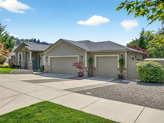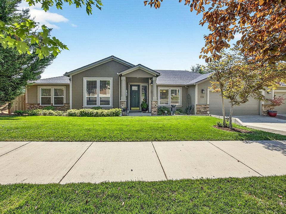 Beautiful East Hills single level home with nice views of Southern Mts and Rogue Valley. Backs up to seasonal creek. Custom built for owners w/extra amenities added. Great open floor plan w/4 bdrms, lg great rm w/a stunning gas log fireplace w/built in bookcases. French doors to a covered deck. Amazing lg kitchen w/2 pantries, granite counters w/island, gas cooktop w/built in wall oven, microwave & refrigerator. Primary suite w/ granite counters, water closet, lg tile shower and walk in closet. Good storage in laundry rm w/washer, dryer and granite counters. Many wide plank wood floors. Stucco exterior w/rock in front yard. Oversized 3 car finished garage w/shelves work bench + another shop/storage rm under the house with 2nd patio w/pavers to a beautiful fenced backyard w/fruit trees, night lighting and shed.