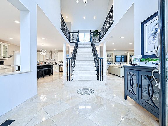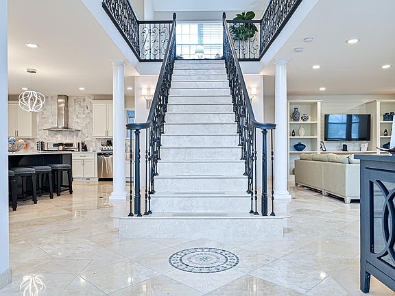 Welcome to this exquisite property where custom design meets modern comfort. The exterior features a charming porch with pavers, private parking, and ample exterior lighting. Inside, a grand two-story foyer with custom marble stairs/floors creates an unforgettable impression. The spacious kitchen boasts a 10-foot island, wine fridge, coffee counter, and a five-burner stove with a warming oven. The great room offers comfortable seating and a custom wall unit housing a television. An entertainment area features a wet bar, TV, mini-fridge, and a pool table. This property accommodates remote work with a dedicated workspace and full bathroom on the first floor. Upstairs, find four bedrooms, three full bathrooms, a seating area, and a laundry room. The primary suite features an extra large room w/full walk-in closet and a luxurious bathroom with a steam shower w/jets and soaking tub. A junior suite and two more bedrooms offer personalized sanctuaries. Additional features include new heating, tankless hot water, new awnings, and window treatments. This property elegantly combines design and functionality for refined living. Don't miss the chance to own this remarkable residence.