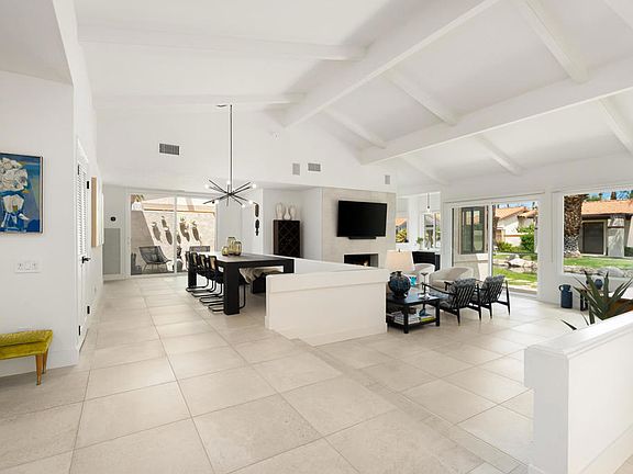 This contemporary Indian Wells home is situated on a cul-de-sac in the very centrally-located gated community of Los Lagos. The most extensive floor plan available in Los Lagos, this 2,942 sq ft home features three bedrooms, including two main bedrooms complete with full baths. Beautifully updated throughout! The interior showcases an open floor plan with a living room, dining area, and re-designed wet bar. High, white-beamed ceilings, a new fireplace surround, new paint & window coverings, and more enhance the space! Fantastic kitchen update...with new soft-close cabinets, new countertops, and sink, just to name a few! Expansive view windows and multiple sliding doors seamlessly merge indoor and outdoor living for the living room, main hallway, and both main bedrooms. The private interior courtyard offers a great space for barbecuing, dining, or sunning. Los Lagos offers captivating vistas of meandering streams and ponds, desirable features such as tennis and pickle ball, a pavilion, and four community pools/spas. Indian Wells Residents can take advantage of discounted golf, resorts, and other amenities and events. Los Lagos is close to shopping, dining, golf, IW Tennis Gardens, and more!