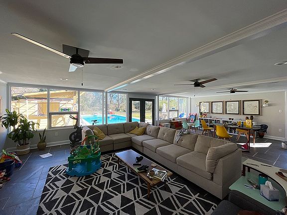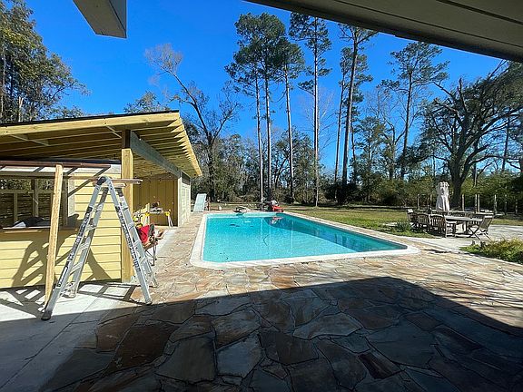 For the growing family is this spacious home, corner lot that sits back. It's on a tree shaded lot with landscape that includes Camellias and other blooming bushes. The interior has a large living room, den overlooking the pool with skylights. The raised part has 3 bedrooms with a full bath each, high ceilings, lots of windows. Off the galley style kitchen is a good sized laundry room with 1/2 bath on end. Den has built ins, lots of space in this home inside & out. New roof and all new high efficiency HVAC in 2021.
