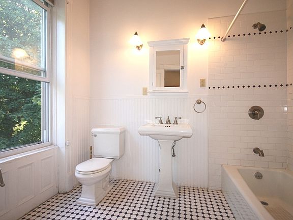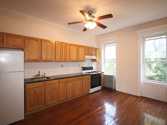 This Sunset Park charming and large 4 rooms, 1.5 bedroom, 1 bathroom apartment is on the third floor of a beautiful private limestone townhouse. Sunny and airy, this 980 sqft apartment has tons of original details including decorative fireplaces, crown moldings, beautiful wood banisters and hardwood floors. Generous size windows and high ceilings add to a great sense of openness and space. Both the kitchen and the bathroom have been renovated tastefully. The enormous windowed eat-in kitchen has granite counter tops and it overlooks a lush garden with views of mature sugar maple tree. The large windowed bathroom has a pedestal sink and subway tiles. There are plenty of closets including a gigantic walk-in. The apartment includes heat and hot water. Conveniently located 1/2 a block to the actual namesake Sunset Park with breathtaking views of the NYC harbor and Statue of Liberty. It is also 1/2 a block to the 5th Avenue shopping district and is 5 blocks to the D, N and R subway lines which takes 20 min into Manhattan.