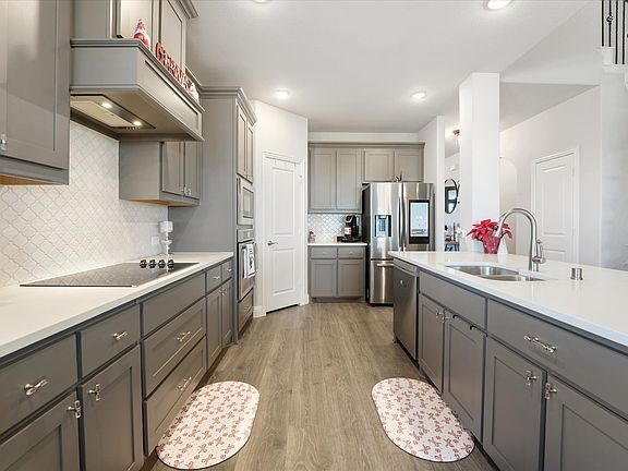 This 4-bed, 3.5-bath home has two living areas, an ensuite setup, and INCLUDES a fully furnished media room with massage chairs, projector, and surround sound so yes, it's set up for real life and entertaining. When you walk in, you'll pass a formal dining space and a front office with french doors and LVP throughout the main areas. The half bath sits just off the mud bench and full laundry room and leads straight to the 2.5-car garage with epoxy floors and additional storage shelving. The kitchen has a massive island, custom cabinets, a walk-in pantry, and a full-size smart refrigerator INCLUDED!! All counters throughout the home are natural stone or quartz. Out back, the covered patio has INCLUDES a mounted TV and a wind break so it's comfortable year-round. Downstairs also includes a large family room and breakfast nook, perfect for hosting. The primary suite is oversized with room for a sitting area, lush carpet, separate vanities, a large walk-in shower, and a massive closet with an additional storage room that doubles as a storm shelter. Upstairs, you'll find another living or game room with a front-facing patio, two large secondary bedrooms, and a third bedroom that works as a second primary with its own full bath. This layout works well for multi-generational living, guests, and working from home.
