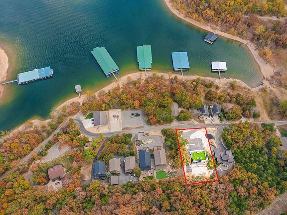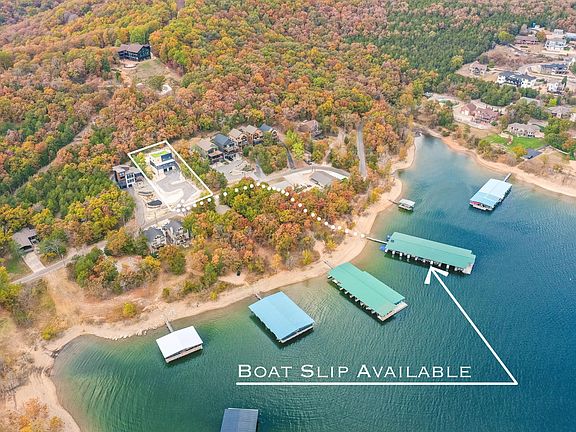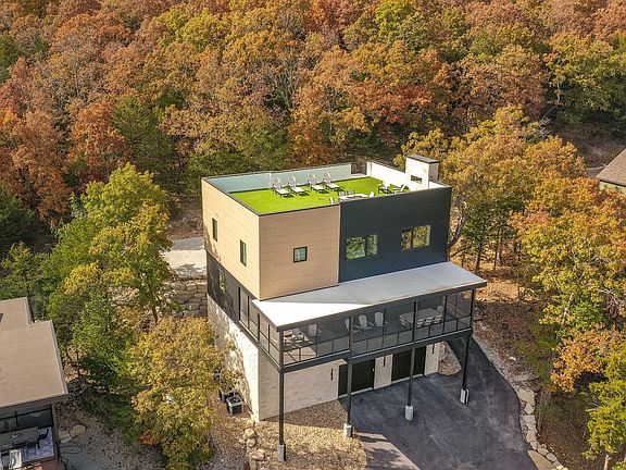 Table Rock Lake Living at it's finest! This Modern Masterpiece is the ultimate in sophistication and craftsmanship! Newly built in 2023, you will be blown away by the VIEWS this property offers! The roof top level is an entertainer's paradise! 1,364 sq. ft of turf, fireplace & spectacular views makes this the spot to be and to enjoy Top of the Rock's fireworks and stunning sun rises. Once you enter the home, be prepared to be in awe as you take in the modern feel and clean lines with features including, open living concept, chef's dream kitchen with a massive island for entertaining, a butler's pantry, an oversized screened in porch is just steps away for evening entertainment. The primary gives you stunning morning sunrises, floor to ceiling tile in the ensuite with your walk-in shower or relax after a long lake day in your soaker tub. There are 2 bunk rooms for friends and kids to enjoy and an additional room for your guests to enjoy. On the lower level you'll find additional sq. ft in garage for a rec room/bunkroom and a full bath. Epoxy flooring in garage. There's even a fenced-in pickleball court! Your 12 x 30 boat slip (available for add'l $) is a short walk or golf cart ride away and the dock is maintenance free with a picnic tables and huge swim platform for soaking up the sun! This house has everything you need to enhance your Table Rock experience for you , family and friends for years to come!