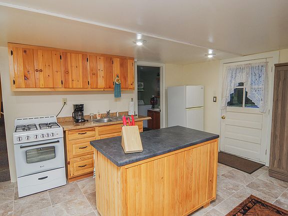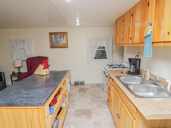 Gambrel style home with 2 rooms on second floor which could be used for bedrooms. Cozy first floor with open concept kitchen, eating area, living room and bathroom. So easy to heat, great starter home or weekend getaway destination. Large shed for all your yard tools. Located on a state road but tucked back away from the road to give plenty of privacy.