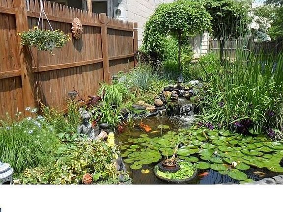This home has very appealing decor, and beautiful natural woodwork throughout. All hardwood floors are exposed and are lovely. The rear yard is wonderful - large, fenced, and with perennial plantings, very nicely done. The pond has a waterfall, fish and even frogs. There's a paver patio, the yard is deep, with off-st. parking in rear off alley. Off-st. parking in front, too. Inside is a bright kitchen, a formal dining room & a large living room. Nice wide stairway leads to 2nd fl. The 2 bedrooms are done in modern-but-neutral colors. The bath has been remodeled, with new vanity & new light. There is an attic for storage only, but there's lots of space up there. The basement could be a game room or play room, and it provides a lot of storage space plus a Bilco exit to rear yard. Brand new electric service. All radiator covers remain. Motion sensor light in rear. Very convenient location, but in the peaceful back yard, you'll feel like you're miles away in the country.