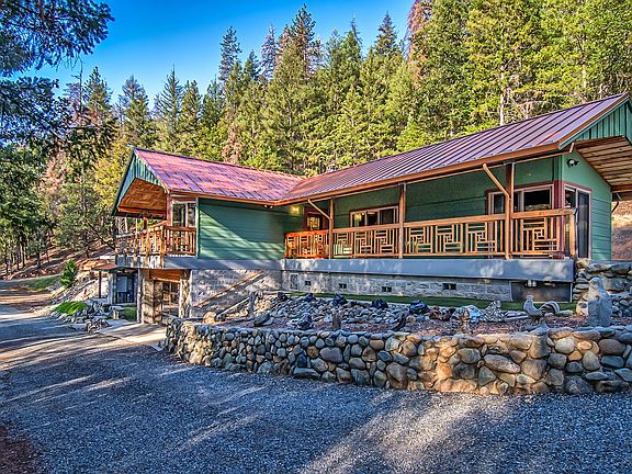 A once in a lifetime opportunity to acquire this spectacular property. A custom design floor plan that is inviting and elegant. This home is situated on the hillside and offers an abundance of privacy 360° around the home and sweeping views of the pine trees and open space. Enjoy listening to the rushing water of Trinity River that is located across the street. Perfect for for the work at home professional. This resort-like home features an open floor plan with vaulted pine ceilings, Cumaru hardwood floors throughout the home, light filled great room with the sliding glass doors to the covered balcony, built-in cabinets, and the exquisite kitchen that offers granite countertops, large island, Guerrero custom cabinets, stainless steel appliances and a butcher block made from cherry, black walnut and maple wood.This home includes a split floor plan, with 2 bedrooms and a separate guest quarters with a bathroom across the covered breezeway with its own entrance. The master suite features sliding glass doors to a private covered balcony, walk-in closet and spa-like bathroom. The 2nd bedroom has built-in cabinets with a murphy bed. Downstairs you will find a sizable room with lighting and a full bathroom. Enjoy the sauna, spa, covered fireplace w/storage and a garden area. 400 amp utility for every type of electrical need.
