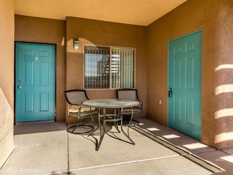 This beautiful, well-maintained condo is on the main level, has SPECTACULAR VIEWS, dual master-bedroom suites, and is MOVE-IN READY! This home features both front and back covered patios to watch the beautiful Mesquite sunrises and sunsets. There is ample storage space with two locked storage rooms. Brand new A/C system. Ready for you to move-in FULLY-FURNISHED, just bring your toothbrush! Not staying are the items in the master closet and the towels in the master bath. Residents have access to the Mesquite Vistas Recreation Center with swimming pool, hot tub, tennis courts and fitness facility.