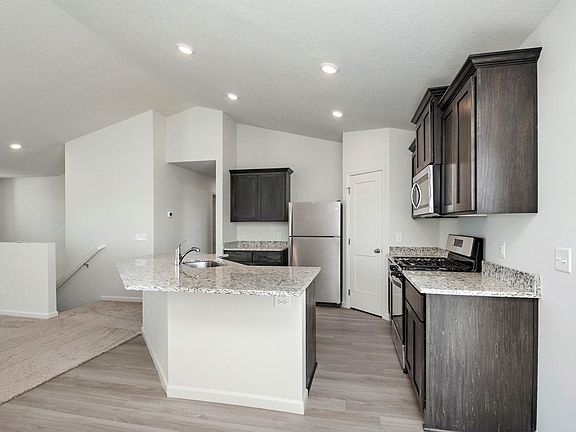 Enjoy the curb appeal and spacious living offered in the attractive Ramsey floorplan at Triplett Farms. This five-bedroom, three-bathroom home features a two-story layout with an open-concept entertainment area. This fantastic home includes a modern, upgraded kitchen with luxury vinyl plank flooring, beautiful handcrafted wood cabinets, stainless steel Whirlpool® appliances, a large island with undermount sink, and a big corner pantry. The spacious family and dining rooms have beautiful vaulted ceilings, creating a wonderful area for making memories with friends and family. This home has 3 bedrooms on the lower level and 2 bedrooms on the upper level including the amazing master retreat with huge walk-in closet. This particular lot has no neighbors in your backyard.