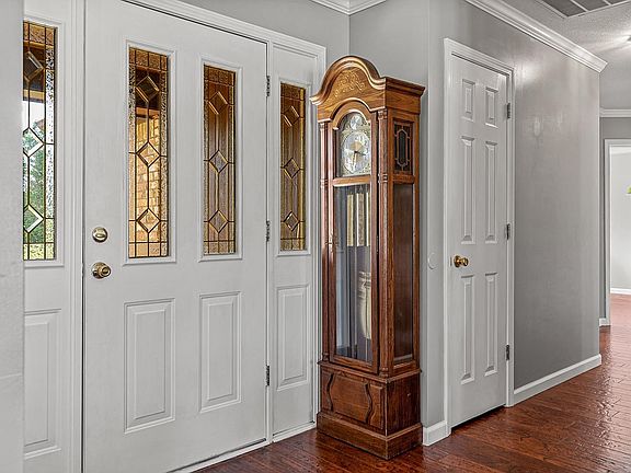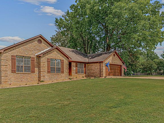 This stunning modern ranch house, nestled on a spacious .94-acre lot with mature shade trees and a privacy-fenced backyard, is truly move-in ready. The single-story home combines contemporary amenities with classic charm. Inside, 5-inch engineered hand-scraped hickory hardwood flooring flows through the living room, dining room, game room, hall, and all three bedrooms. The kitchen features elegant granite countertops, a built-in desk, and ample cabinet space, perfect for culinary enthusiasts. The master suite offers a spacious walk-in closet, a luxurious jetted tub, and a walk-in shower. Two additional bedrooms share a stylishly tiled bathroom. The walk-in laundry room includes a folding station and pantry for added convenience. Multiple living spaces include a formal dining room and a versatile den currently used as a game room. The living room features a cozy gas log fireplace, complemented by indoor LED recessed lighting and outdoor LED lighting. The expansive backyard boasts a 26x21 pergola for relaxation or entertaining, a 20x18 workshop with an overhead door, and beautifully maintained flower beds and mature trees.