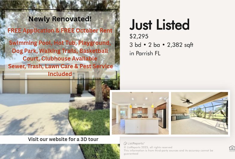 FREE APPLICATION & FREE OCTOBER RENT ** New listing with 10 Stars Property Management ** Beautiful 3 beds 2 baths Single-Family home is available for rent in Parrish, FL. Discover the perfect blend of comfort and convenience at 4410 Natures Reach Terrace in Parrish, FL! This beautiful home is nestled in a peaceful community while keeping you close to everything you love, just minutes from Ellenton Premium Outlets for shopping, a variety of local dining options, and quick access to I-75 for an easy commute to Sarasota, St. Pete, or Tampa. Nature lovers will enjoy nearby Fort Hamer Park with boat ramps and scenic river views, while families can take advantage of top-rated schools and community parks. Whether it's a day at the white sandy beaches of Anna Maria Island, a round of golf at one of the area's courses, or exploring Lakewood Ranch's entertainment and events, you'll find endless attractions just a short drive away. This location truly offers the best of Florida living! 3D Tour Available: Features: - Application fee will be credited back on the 1st month of rent if approved - Located in a gated community for added privacy and security - Brand new roof for years of worry-free living - Mix of tile and laminated wood flooring for durability, easy to maintain, and modern style - Cozy carpeted bedroom for added warmth and a soft touch underfoot - Open space layout flows seamlessly into the living and dining areas for spacious feel - Sleek stainless-steel appliances for everyday convenience - Granite countertops adding elegant style and easy to maintain finish - Breakfast bar perfect for casual dining and entertaining - Dishwasher included for hassle free cleanup after meals - Ceiling fans keeping the area cool and comfortable year-round - Dedicated office/extra room with built-in shelving perfect for work and extra storage - Elegant plantation shutters that enhance privacy, light control and style - Walk in closet for ample storage and organization - Bathtub and stand up shower for versatile bathing options - Double sink vanity for added convenience during busy mornings - Screened-in lanai area for outdoor enjoyment without the bugs - Built in outdoor kitchen that includes a grill perfect for effortless entertaining - Laundry room equipped with washer and dryer for ultimate convenience - 2 car garage for secure parking and added storage - Dedicated workshop in 3rd garage bay with extra storage for motorcycle/golf cart - Part of a well-maintained HOA Community with $125 application fee per person - Swimming pool and hot tub, playground, dog park, walking trails, basketball court & clubhouse access - Lawn Care and Pest Service included - Sewer and Trash included - Tenant is responsible for power and water Pets are allowed. No more than 2 pets per property. Weight limit of 55lbs per pet. No aggressive breads. Applicants must complete a free pet application and have animal approved with vaccination record. The monthly pet fee will be determined by your pet screening score. Does not apply to medically/emotional support prescribed and/or service animals. At 10 Stars, we offer multiple services to make your stay with us easy and comfortable. We have a same-day application approval and a quick move-in for no additional cost. Our team is professionally trained and will be able to assist with any leasing, billing, or maintenance issues our tenants have. We also offer an emergency line available 24/7 for any urgent cases. Tenants have access to an online portal where they can make rent payments, communicate with our team and get updates on their payments and maintenance requests at all times. THE FIRST MONTH AND SECURITY DEPOSIT ARE REQUIRED Renter's insurance is required prior to moving in. Rules and Regulations are on our website! Only $65 non-refundable application fee per adult with 10 stars property management