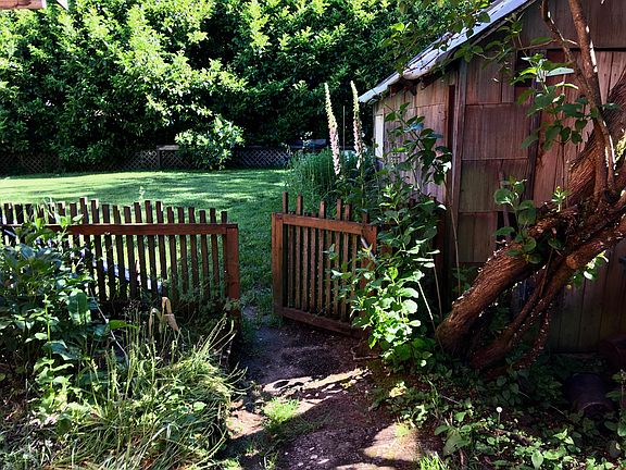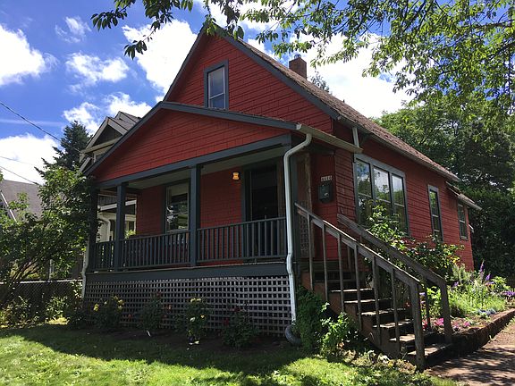 1910 old Portland farmhouse with large shop for sale on a 7500 s/f corner lot one block from the Lewis School in the lively and wonderful Woodstock neighborhood. Small but delightful 1100 S/F (not including unfinished full basement) house has beautiful vaulted ceiling in front living room, renovated country kitchen, 2 bedrooms, small sitting or maybe office space upstairs, one bath, and wonderful 8x12 enclosed sunroom back porch. House has been updated carefully to retain old charm with varnished hardwood floors in living room and bedrooms and classic old style linoleum in kitchen and bathroom. Kitchen combines classic vintage appliances with some original features and Ikea cabinets, farm sink, new dishwasher and butcher block countertops. 1240 S/F shop was built in 2008. With a 20x40 footprint built on a heavily reinforced cement pad it is a 2 story space with 9 foot ceiling downstairs and a finished upstairs 12x40 studio space featuring painted sheetrock walls and ceiling and 2 Velux opening skylights. The shop is overbuilt by west coast standards (builders were from New England) with 2x6 walls and 10” ceilings all fully insulated. 12x16 coved shed off of the back of the shop is currently used for wood storage but makes a great covered patio for backyard events! It is a classic building that makes a great shop but could be converted to a house if lot were to be divided. House was rewired some time ago and is fully inspected and approved by the city. House was converted from oil heat to gas recently (inspected and approved by the city) Old oil talk has been removed. New gas furnace one year ago. Vintage Wedgewood double oven gas stove with griddle in kitchen. New cement driveways to shop and house. Shop was built to exceed all city codes and has been fully inspected and approved by the city. There is a 10x16 garage between the house and the shop with a cement floor. It is in fair condition but is a great place for yard tools, lawnmower, etc. It could be rebuilt without needing a permit as it is under the 200 S/F requirement for such projects. The property is bordered on 2 sides by an amazing and beautiful laurel hedge. It creates not only wonderful privacy but also a virtually impenetrable wall between the alley to the west and the neighbor to the south. The big back yard is sunny and pet or child safe with fence and hedge closing it off from all sides. There is room for a nice vegetable garden. In keeping with it’s heritage of being an old walnut farm there are large old black walnut trees on 3 or the 4 corners of the lot.