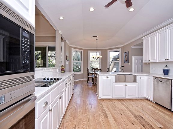 Contemporary meets Traditional at this elegant Westview on Lake Austin home. Nestled among towering oaks on a private long cul de sac, this stately Harvey Atwell home features a gorgeous kitchen transformation with open concept to family room, new counters, backsplash, hardware and some appliances. Hardwood floors have been completely refinished, bright paint throughout, and a shower has been added to the downstairs bath. Large .63 acre yard with pool, family neighborhood in Eanes School District/ Bridge Point Elementary. Three car garage plus workshop. This home is move-in ready for your buyers!