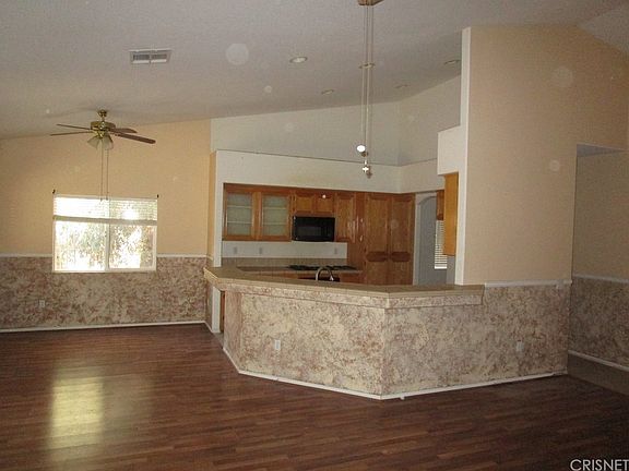 This Westside Lancaster home is tucked into a quiet cul-de-sac on a quiet, tree-lined street close to Antelope Valley College, schools and shopping. The desirable single-story design enjoys a Great Room configuration with handsome wood flooring that also flows throughout most of the home. Twin ceiling fans, a contemporary fireplace and custom tilework on the walls provide decorative eye candy in the Great Room and the kitchen includes upgraded cabinetry, tile counters and a breakfast bar. The master bedroom features a walk-in closet and private bath with dual sinks, upgraded walk-in bathtub and a separate shower. Three more bedrooms and another full bath, along with the convenient laundry area, complete this lovely home. The attached two-car garage provides for parking and a backyard shed provides extra storage and there's plenty of outdoor entertaining space on the covered patio.