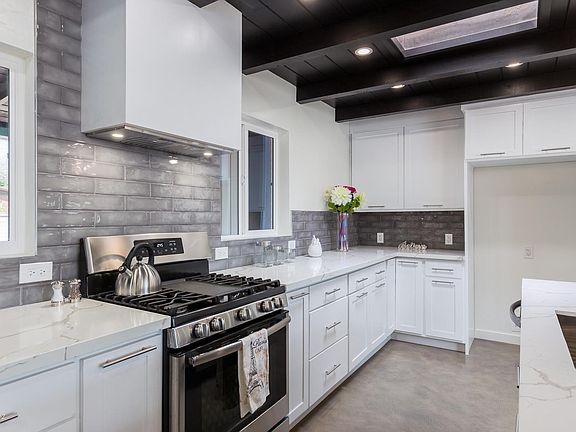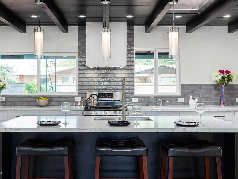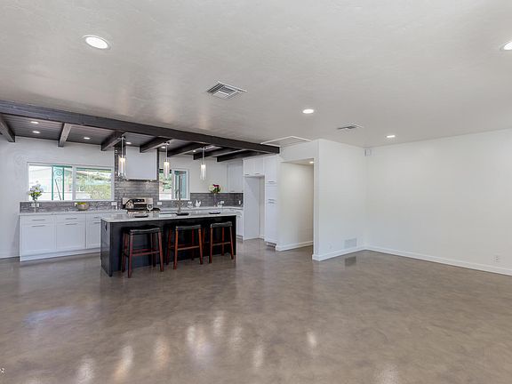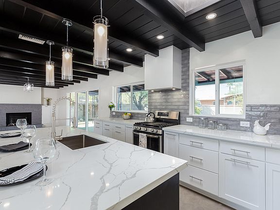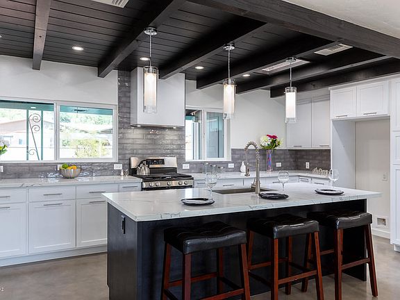 Another stunning Quihuis Architecture remodel in the highly sought after Poet's Square. This home exudes elegance, upon entering you will quickly take note of the exposed dark wood ceiling above the kitchen and dining area, which pairs well with the concrete overlay flooring throughout. The quartz counter tops and white shaker style cabinets soften this bold look. There are 3 beds, and 2 luxury baths both completed with floating vanities and tile surrounds. The home includes all new windows, doors, and a fireplace at the dining area. At the backyard you'll find an expansive patio w/pavers and a large lot ready for your touch. Close to shopping and dining.