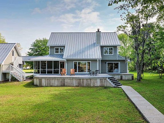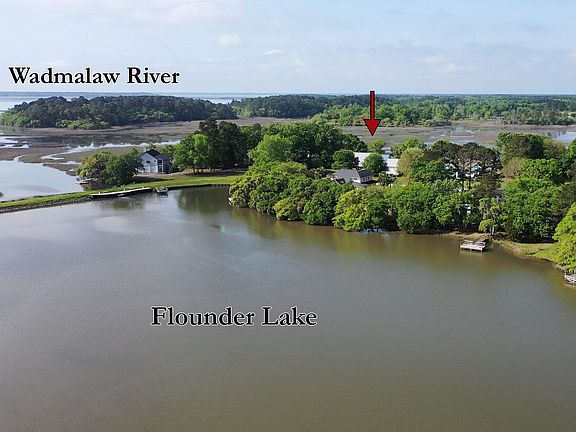 Beautiful and relaxed waterfront home in gated Belle Vista subdivision. This unique getaway lies across the street from the community boat landing at Flounder Lake - one of Charleston County's largest saltwater impoundments, measuring over 80 acres. This home has its own dock on a tidal creek leading out to the Wadmalaw River, as well as another community boat ramp that provides access into the tidal creek. Recreational opportunities include boating, kayaking, fishing, shrimping, crabbing and more.The expansive back porch and a screened-in porch offer a wonderful viewing area to watch shorebirds in the live oaks, the ebb and flow of the tide, family & friends fishing on the dock, and beautiful sunsets....The Hardie-Plank home features hardwood floors, a brick fireplace, vaulted and beamed ceilings in the living room, an eat-in kitchen with granite countertops, and a full bathroom in all three bedrooms. Plenty of storage available in the three-car garage and over 800 sq ft of living space with a full bathroom in the FROG. Within 20 minutes of nature trails at Meggett County Park, Roxbury Park and Caw Caw Interpretive Center, and within minutes to several restaurants and grocery stores. An easy drive from Edisto Island and just over 30 minutes to Edisto Beach.
