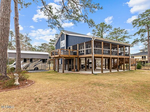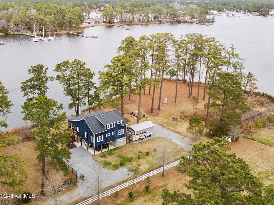 Welcome home to your quintessential Coastal Carolina waterfront gem on the shores of desirable Broad Creek near Oriental and River Dunes!. A like-new, 2-bedroom residence constructed to exacting specifications with artistic flair to fit the unique and compelling waterfront location which it presides over! The moment you drive up, you'll know you've arrived somewhere very special... The location is unlike any other and the home, although new, blends and harmonizes with its waterfront setting among the trees so effortlessly. The panoramic views unfold as you walk up the steps and enter the home. Vistas up, down & across gorgeous Broad Creek await! The inviting vaulted great room is bright and open, yet retains a very cozy feel to it... The room is anchored by a gorgeous hearth and fireplace, inviting convivial gatherings or for spending quiet evenings with family. An open kitchen is a central element and the unique tiled wall around the state-of-the-art Z Line dual fuel stove allows the chef to enjoy the waterviews and company in the living areas. A large screened porch will draw you out to the true ''catbird seat'' overlooking the creek and you'll be treated the rarity of beautiful sun (and moon) rises and sunsets from its unique vantage point.... not to mention wildlife and lots of boating activity. There is a salt water hot tub on its private porch with lovely views and a grilling area on the screened porch. Move furniture from the ground to the deck with ease using the elevator/lift! The bedrooms have ensuite baths and sunny views of field and water! Upstairs is a great multi-purpose room (also with a full bath) awaiting your plans - whether office, media or den. The area under the house is paved and has covered parking, shaded patio areas and a workshop! So many features that you'll appreciate! New RV/boat shelter, and so much more!
