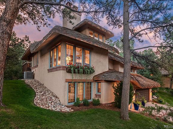 If you’ve been waiting for the rare opportunity to own a coveted Orofino Place cottage in the sought after, gated, Village at Castle Pines community, you now have the chance to be one of a lucky few! Designed by renowned architect C. Steven Georges, this charming 4 bed | 4 bath residence is located in a 19-home enclave and offers a magical storybook setting where flora and fauna abound. With a stucco and stone exterior and one-of-a-kind cedar shingle, rolled shake roof, the European appeal of these special homes is well-known throughout The Village and beyond. Nestled on a mountain-view lot with a private yard, soaring pine trees, and 30-foot water feature, you’ll feel as if you’ve wandered into a fanciful English fairy garden the minute you step outside. Inside, this multi-level home features exposed wood beams, brick accents, hardwood floors, sand-plaster walls, and vaulted ceilings. The entry level offers an en suite guest room, 2nd bedroom with built-in shelving currently used as a spacious office, additional bedroom, and bathroom. Continuing upstairs, the family room features high ceilings and a gas fireplace, and the newer kitchen includes Miele and Bosch appliances, Sub-Zero refrigerator, display cabinets with recessed lighting, wet bar with beverage fridge, recently installed cabinets with added storage, and roll-out drawers. The dining room sits adjacent to the kitchen and opens to a lovely, covered deck. Upstairs you’ll find an owner’s suite with Juliette balcony overlooking the protected, forested land outside, fireplace, and owner’s bathroom. Counters have been updated with Carrera marble. Multiple covered and open outdoor spaces offer a respite to relax and appreciate the wildlife corridor and abundant gardens. Featured in Architectural Digest among other publications for its noteworthy architecture and design, this singular home must be seen to be fully appreciated. Once you do, you’ll be transported to a bygone era filled with whimsy and wonder!