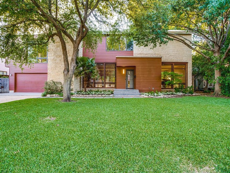 Unique Hill Country Modern home in desirable low traffic section of Bluffview Estates. Open floorplan maximizes space with views and access to oversized backyard playland throughout. Perfect for indoor-outdoor entertaining and room for pool. Level 1 offers 10' ceilings, 2 living areas w-pass-thru fireplace, walls of Pella windows, waxed oak flooring, matched-grain cherry cabinets, open kitchen with Wolf-Subzero appliances and dual Bosch dishwashers, wet bar, mud room, full bath and large flagstone patio with fireplace. Level 2 has 9' ceilings, master BR suite, 3 additional BR's and landing with sitting area. Recent addition includes office with built-ins, large playroom, full bath, wet bar and 2nd utility room.