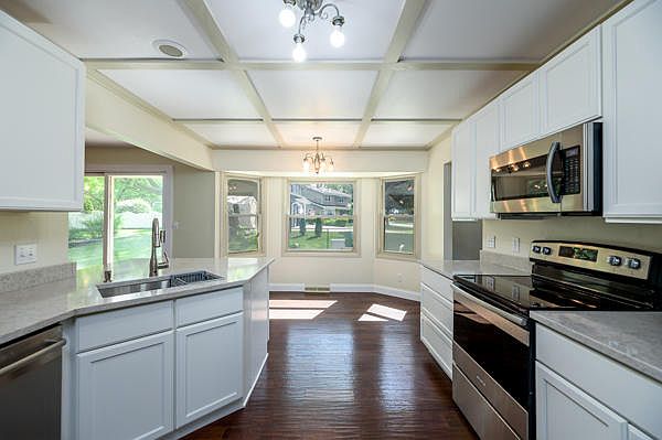 Move in ready SPACIOUS and REMODELED ranch home in desirable neighborhood! Low maintenance exterior with aluminum trim and vinyl windows has been recently painted. BRAND NEW ENTRY DOOR leads to stunning engineered HWF flooring throughout living area! BRAND NEW CARPETING in bedrooms and rec room! NEW cabinets, QUARTZ counter in kitchen PLUS new SS appliances! Vaulted ceiling in living room with grand natural fireplace. MASTER BATH features jetted tub, walk in shower, NEW VANITY AND LVT FLOORING. 2nd full bath features LVT flooring and NEW vanity counter! HUGE recroom is bright and inviting with EXTRA bonus room. Great for office, playroom or your choice! PLUS 1/2 bath in the lower level with NEW toilet, NEW vanity and NEW flooring! WOW!