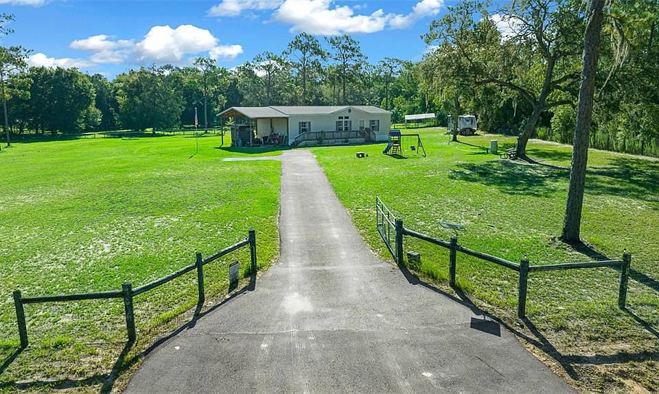 Bring your horses without breaking your budget! Great working potential in this mini farm with over 5 cleared and fenced acres, and located less than 15 minutes to the World Equestrian Center. The 2011 mobile home features a great open concept floor plan with 3 bedrooms and two baths, and a huge kitchen that comes complete with cherry cabinets, an expansive center island, stainless steel appliances, and a walk-in pantry. The primary bedroom has a walk-in closet and an ensuite bath with a soaking tub and separate shower. The home has laminate flooring throughout most of the home, and vinyl flooring in the wet areas for easy cleanup. Long decks in both the front and back of the home, an asphalt driveway and a gated entrance with entry remote complete the package. The back deck even has an oversized awning for shade on those hot summer days. The roof was recently replaced in 2022 and HVAC system replaced in 2019. Well and septic were installed in 2015. The property is entirely fenced in Diamond V mesh, and cross fenced in 2x4 mesh with a top board. The high and dry acreage is zoned agricultural for horses or livestock, and the property also features an RV hookup, a shed for storage, and a covered carport tall enough for your horse trailer. Living here, you’ll enjoy quick access to the World Equestrian Center for competitions and events, or just enjoy riding your horse along nearby riding trails. And when the riding’s done, cool off at the world famous Rainbow Springs or KP Hole Park just 10 minutes away and enjoy swimming, kayaking, or tubing. So much opportunity for so little $$$! The mobile was moved to the property in 2015, so financing options are limited. Florida Credit Union will finance with approved credit.