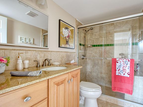Renovated 2/2 with tropical views off screened balcony. This pristine unit exposes a warm ambiance & natural light with kitchen wall down, beautiful cabinets with pull out drawers, washer & dryer, walk in closet, tile throughout & this unit is coming turnkey. Community pool out your front door & extra storage available. Experience the peace & security of manned guard gates & 24-hour security patrols all located on lush, tropical grounds. You are minutes away from the Fla. Turnpike, I95, Polo grounds, Kravitz Center, restaurants, entertainment, hospitals, places of worship and the beach. Unit is priced to sell.
