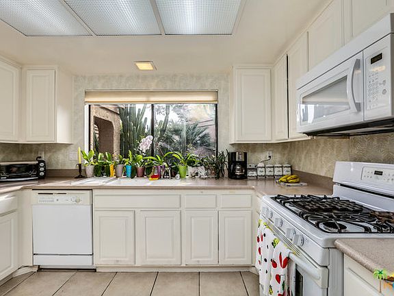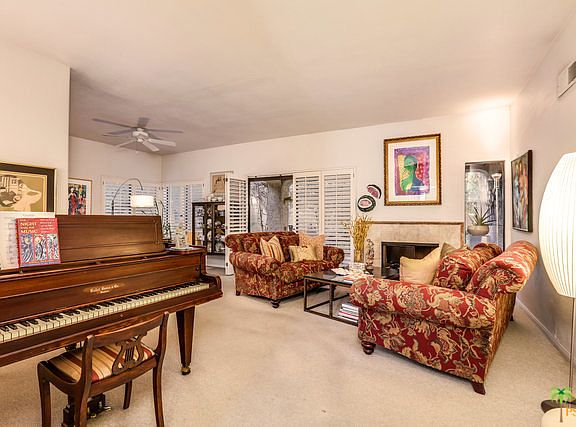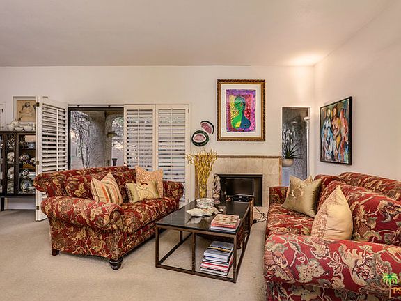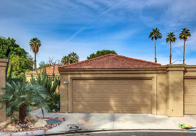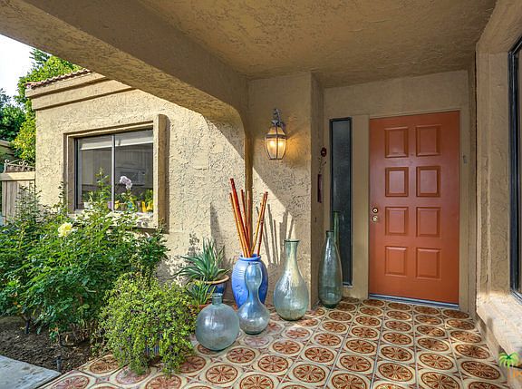 Wonderful 3BR/2BA Single Family Attached home with Solar! Ready to be refreshed with your design ideas. Prime Location on a peaceful cul de sac. Comfortable Living Room with fireplace and adjacent Dining Room opens to the large wraparound covered patio with misters and lush trees and shrubbery offering cool shade and ultra privacy. Functional Kitchen with gas stove, pantry, tons of cabinetry and counter space, plus Breakfast Area. Tastefully landscaped Atrium provides a desirable separation of the Master Suite and Bedroom #1 and Bedroom #2 (currently an office). Enlarged Master Suite with walk-in closet includes a Bonus Room - or Den/Office/Additional Sleeping Quarters. Plantation Shutters throughout home. Ceiling Fans. Two Car Garage with ample storage. Hidden Palms is highly desirable as it offers many social activities and features 4 Pools/Spas, Tennis, Pickle Ball. HOA includes Trash, Cable with HBO and Internet. Close to El Paseo shopping and restaurants. Great investment opportunity.