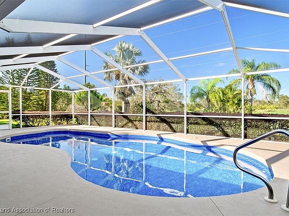 BEAUTIFUL, SPACIOUS, POOL HOME IN GREAT GOLFING COMMUNITY. 3 bedrooms + office or 4th bedroom, 2.5 baths, 2 car garage w/golf cart entry and tons of updates including interior & exterior paint, carpet, A/C, pool liner & filter, window blinds, landscaping & more. Step inside to find a formal living & dining room, plus family room adjacent to the kitchen. The kitchen features an abundance of staggered wood cabinets, granite countertops, tiled backsplash, pantry, desk, breakfast bar, plus eat-in area with large miter glass window overlooking lanai & pool. The primary suite has a tray ceiling, 2 walk-in closets, and a luxurious bathroom with soaking tub, corner shower, his & her sinks, private water closet, and large glass block window allowing in plenty of natural light. For privacy, two guest bedrooms and a guest bath are located on the opposite side of the home. The 4th bedroom or office is located up front through lovely french doors. There's a convenient half bath that opens to the huge covered lanai & pool area. The lanai & pool can also be accessed from the living & family rooms, making it great for entertaining. This home is situated on a large, nicely landscaped lot with decorative concrete curbing and painted driveway. The secluded backyard and pool area back up to Highlands Hammock State Park land, offering a peaceful retreat & great space for outdoor activities.