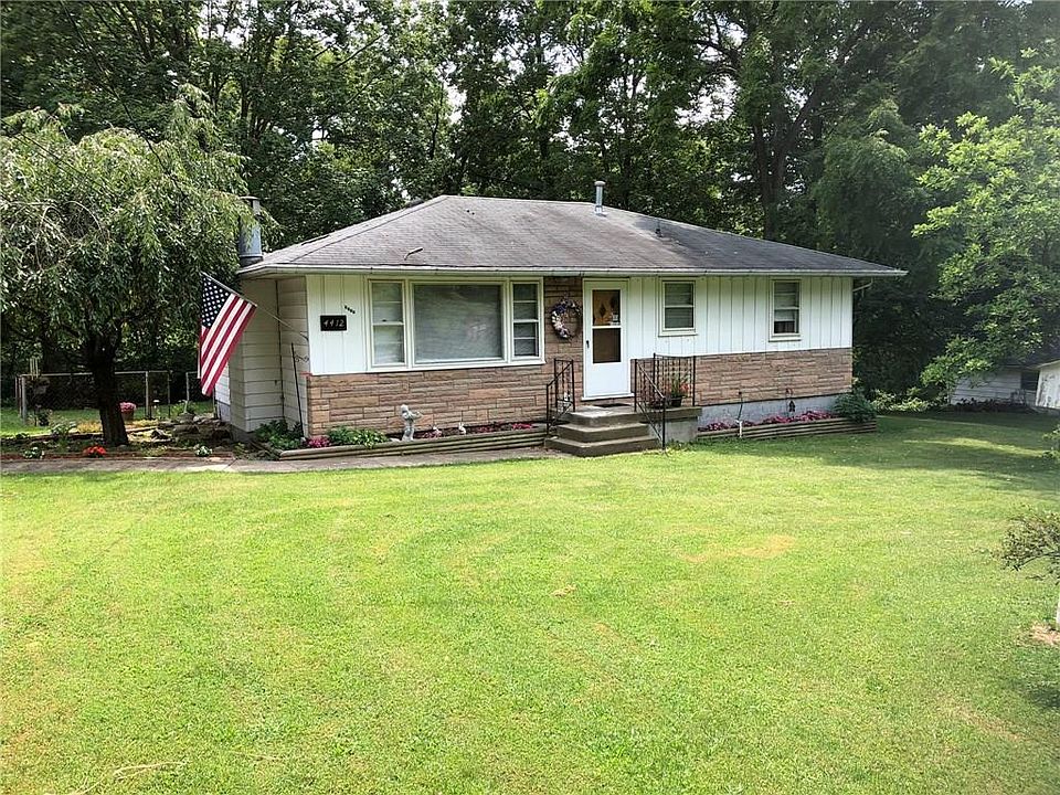 Aluminum ranch home with 4 bedrooms, 2 full baths, family room in full finished basement. Hardwood floors! Sewer and water lines from street to house 3 yrs. ago. Updated furnace, 2 updated bathrooms, central air 3 years ago, roof about 10 years old. Updated kitchen! Large deck on back of house! Beautiful yard! One wood burning fireplace! City utilities plus a well (well not used since 1975). 988 sq. ft plus finished basement. One car detached garage. Storage sheds. One year home warranty with sell of home with ORA.