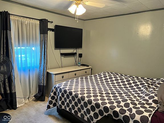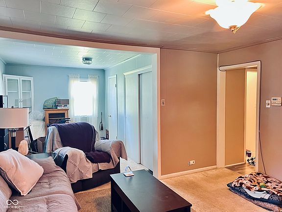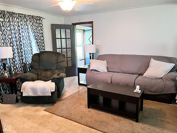 Great location on Terre Haute's south side. So much potential for this cute 1000 sq. ft. 2 bedroom, 1.5 bath home. The lot is almost 1 acre. You could add a pole barn, re parcel part to build, put in a pool..whatever you want with this much yard! Master bedroom is large with a half bath. Living room is spacious. There are closets in the extra living room area. Enclosed front porch is perfect for work at home space or enjoy as a sun room. Kitchen has plenty of room to eat in or you could use the extra living room area as a dining room. Basement is clean offering interior storage space. Step out back to a covered patio installed in June 2024. Detached 2 car garage.