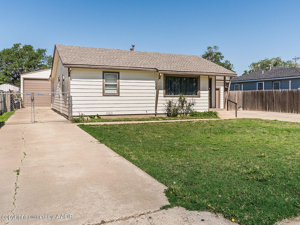 New roof, new paint, and new carpet in this cutie with a large detached shop! Home has central heat & air, 3 bedrooms, 2 baths, and a 1 car attached garage.. Kitchen has a refrigerator & gas oven, and washer in the utility room will convey. Carpet throughout has been replaced this year. 2nd driveway leads to the large detached shop with lots of cabinets & shelves that will convey. Fenced back yard.