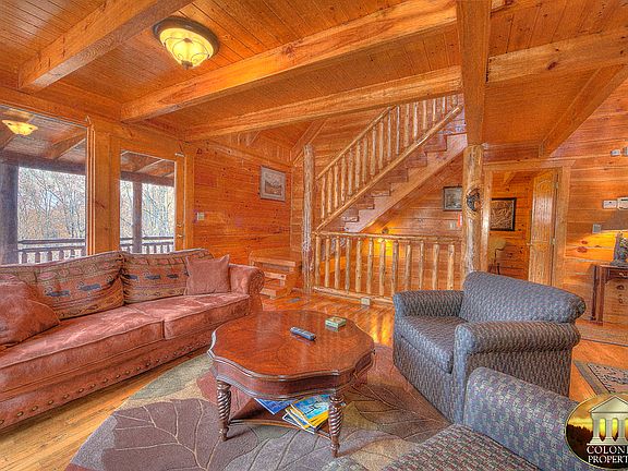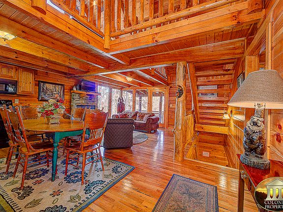Gorgeous large log home with many luxury amenities. Three large levels of log cabin living. Beautiful main floor luxury master suite with custom master bath. Master bath has creek stone surround and two sided fireplace for those romantic evenings. Master bedroom opens out onto a large deck. Large spacious great room has a gas fireplace as it's focal point. Charming custom bear carvings adorn the cabin's posts. Upstairs loft has a gameroom and a second bedroom suite. The lower level has sleeping quarters and a second family room, that opens to a second deck. Ample parking large enough for three vehicles. Just minutes to the Arts and Crafts Community.