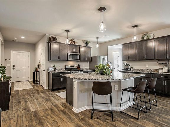 Nearly new with several great upgrades. Best square footage for the price. The Kingston floor plan is well loved for sizes of the kitchen, living room, and master suite. Upon entering the home you will notice the nice entry way, so you don't walk straight into the living area. The large kitchen has granite counters, stainless steel appliances, pantry, and huge island. The living area is great for entertaining and can easily manage the largest of sectionals. Near the front of the home are 2 bedrooms with a full bath. The third bedroom is located near the living room, and the primary suite is in the back. The primary suite is large enough for a sitting area and/or an office space. The primary bath has 2 sinks, shower, storage, and a nice walk in closet. The back yard has a covered patio and open deck. Special features include added storage and work table in the garage, storm shelter, stained wood deck, redesigned landscaping in front and back, sprinkler system, full guttering, garage door opener, tankless water heater, blinds, and new vinyl flooring. There are 8 years left of the RWC structural warranty. Ask about the assumable VA mortgage at 4.25%. YOU DO NOT HAVE TO BE A VETERAN TO QUALIFY!! The neighborhood has 2 playgrounds and a pool. Great location near the Mustang Community Center and HWY 152. Sellers would consider a lease/purchase contract or early occupancy. $2200 per month.