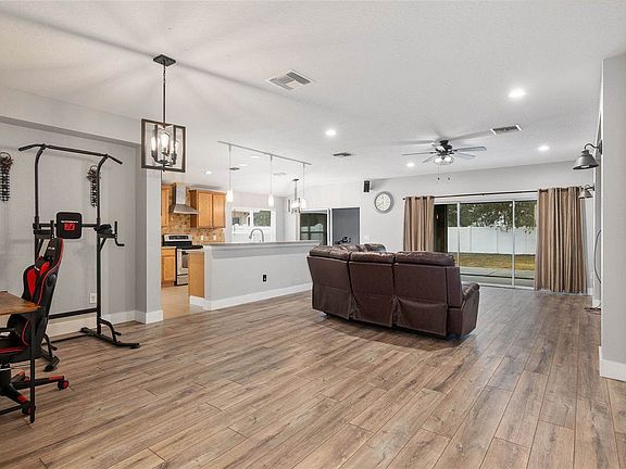 ** PRICE REDUCTION** Explore this charming 3-bedroom, 2-bathroom home in the beautiful Red Hawk area of Fore Ranch. Featuring recent updates like laminate flooring and a 2021 roof, this home shines with a light, open floor plan. The spacious living area opens to a kitchen equipped with bar seating, tumbled marble backsplash, an upgraded range hood, and a pantry for additional storage. Outside, enjoy a vinyl privacy fence, a screened lanai, an extended patio, and a fire pit perfect for gatherings. The community offers excellent amenities: a clubhouse with games, a sparkling pool, splash pad, gym, playground, basketball and tennis courts, a soccer field, and new walking trails. The pond is great for walks or runs, and there's even a path for dog walks. Conveniently located near shops, restaurants, banks, a hospital, an elementary school, and the World Equestrian Center. Don't miss out—schedule your appointment today!