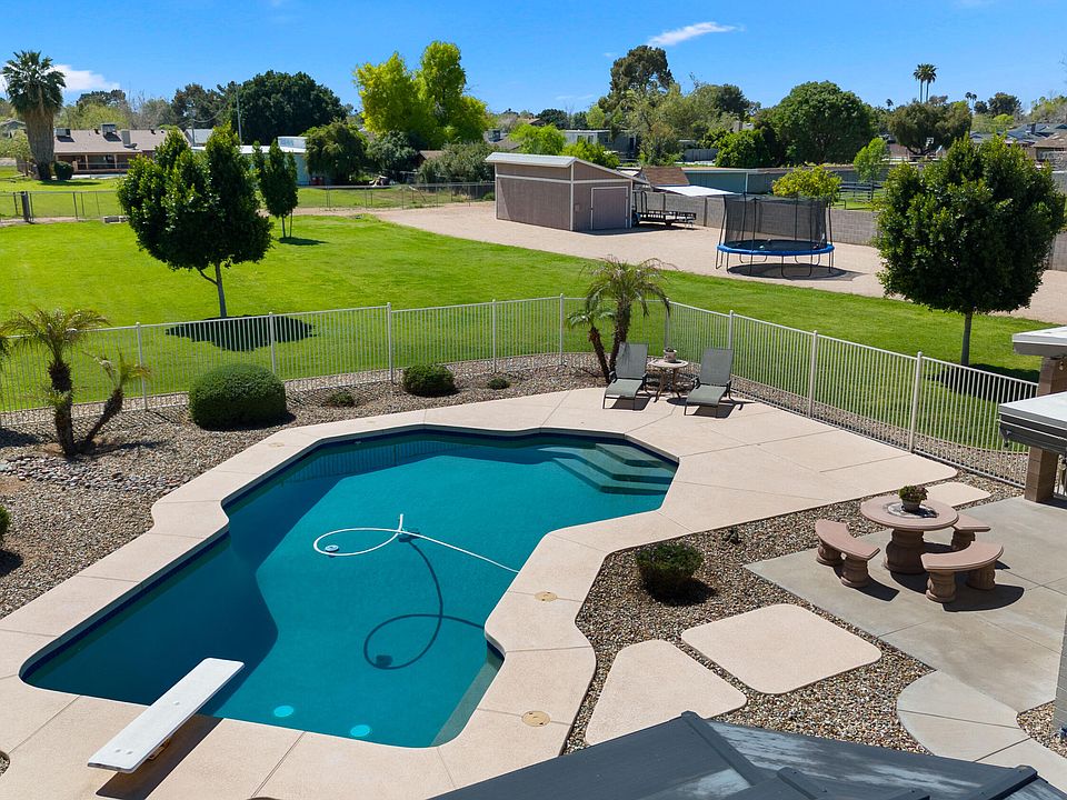 Beautifully remodeled 4-bedroom, 2-bathroom home situated on nearly an acre of land in coveted Sunburst Farms neighborhood offers a luxurious living experience with its array of amenities. As you step inside you're greeted by a meticulously remodeled interior boasting modern touches and comfortable living spaces. Kitchen, features granite countertops, ample cabinets, and all necessary appliances for culinary enthusiasts. Layout is thoughtfully designed with a split floor plan ensuring privacy for the primary bedroom located on one side of the house and remaining three bedrooms and guest bathroom situated on the opposite side. Entertaining is a delight with spacious formal living and dining rooms leading seamlessly to the large family room, offering picturesque views of the lush backyard. The backyard is a haven for relaxation and recreation featuring a diving pool complete with basketball hoop and umbrella sleeves, expansive cool decking for lounging, and manicured grass lawns. For those who enjoy tinkering or need extra storage space, the property boasts a sizable 12' by 28' shed with electricity, offering endless possibilities for use. An RV gate allows for easy access, with no HOA restrictions on parking, and the property can be accessed from both the front yard and the alley. Evenings can be spent under the stars in the tranquil gazebo tucked away for peaceful moments. Inside, recessed lighting adds to the ambiance, while the hall bathroom features a classic cast iron tub and the primary bathroom boasts newly finished tile surrounds. Both bathrooms boast matching cabinets and granite countertops, mirroring the elegance of the kitchen. Overall, this home presents a rare opportunity to enjoy a blend of modern comfort, outdoor serenity, and convenient amenities in one of Sunburst Farms' most desirable locations. This property is a GEM and definitely warrants a vist to fully appreciate its charm and amenities!
