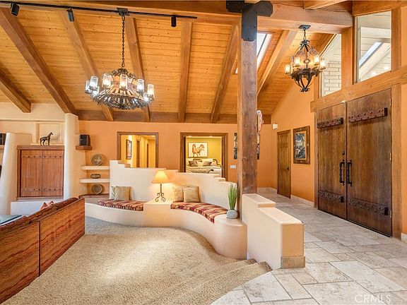 The winding driveway leads to the captivating, 3809 square foot single-story home and showcases distinguished craftsmanship in a balance of rustic comfort and stylish luxury. In addition to the event level parking, the grand Southwestern inspired entrance has a welcoming allure that immediately captures your attention. Soaring, vaulted, exposed beamed ceilings, natural stone floors and awe inspired windows beautifully frame the mesmerizing view and leave a lasting impression.