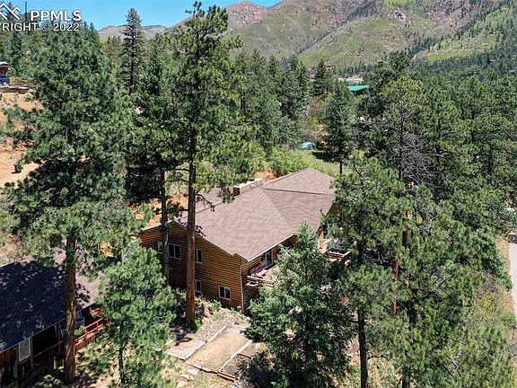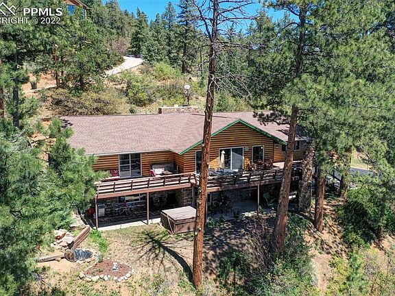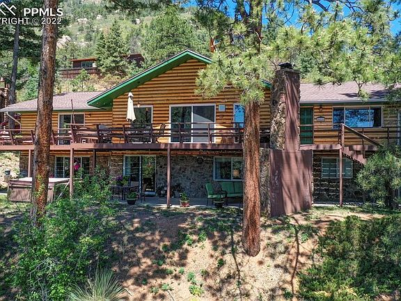This property is a hidden gem tucked back in the woods elevated on the mountain with 360 degree views just minutes from several Pikes Peak tourist attractions, hiking trails, shopping, restaurants, Manitou Springs, and so much more! Whether you're looking for a perfect place to call home or looking for a potential investment property, this home has it all. As you enter the home from the wrap around porch, you will find a spacious living room to the left with a grand fireplace and vaulted ceilings. All of the windows allow in lots of natural light and amazing views. There is an office to the right and down the hall, is a fully renovated kitchen with stone countertops, custom cabinetry, a built-in pantry, and easy access to the outside should you want to dine outside with views. The spacious master bedroom has 2 large closets, walks out to the deck with more wonderful views, and it's own fully updated 5 piece master bathroom with a custom tilework shower and dual showerheads. There are 2 more bedrooms upstairs with a jack-n-jill bath. Head on downstairs where you'll be equally impressed with the family room that has lots of space for entertaining, playing games, or relaxing by the fireplace. There is an additional entertainment area around the corner that has a wet bar/kitchenette perfect for guests along with another bedroom with a walk-in closet, and 2 additional bathrooms. There is easy access to the outside where you will find a hot tub with impeccable views and a custom stone fireplace, built to match the home. And if that's not enough, there is a separate cabin built in 1914 on the property that has been perfect for guests. Fully updated, it still has lots of charm and a rustic feel with a stone fireplace and wooden stairs that lead to a loft. The cabin has a quaint family room, kitchen with a separate dining area, 2 bedrooms, a bath, and laundry space. Be ready to fall in love with this property as you enjoy a piece of mountain paradise.