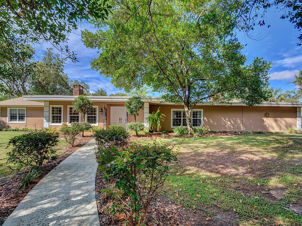 AMAZING HOME with a History on 16+ ACRES! Custom home owned by former Professional Football Player, Commentator & Actor: Dick Butkus, and improved by current owners. This is a home with space for a multi-generational family or for the person who wants land, privacy and a place for everything. A winding drive takes you to designated parking corral with a walkway to the front door, or to the 8 space Carport. Beautiful formal LIVING room with flag-stone, wood-burning fireplace, & French door to the Covered & Screened LANAI. Large formal DINING room. Kitchen offers stainless appliances, double sink and window looking to Lanai and rear yard. Space next to kitchen can be dinette. Spacious 23x21 FAMILY room with access to a study or exercise room. Split bedroom plan. Two bedrooms on one side of the house with 2nd bedroom having French door to the in-ground heated spa. Right side of the home offers guest bedroom, large utility room and entry to the master wing and office/ 5th bedroom. The MASTER Suite has a wall to wall brick fireplace and a sky light. Master bath has separate vanities and closets, fabulous soaking tub with plant shelves, lg walk in shower and wood beamed ceiling. Office/5th Bedroom has vaulted ceiling and striking wood ceiling and walls. Most remodeling 2003+. In ground open air POOL, PAVILION 32x31 set up for summer kitchen, bar, fire pit and various sitting areas. Pole barns, storage shed. Minutes from shopping, medical facilities, Stetson University & Downtown DeLand. Fabulous grounds!