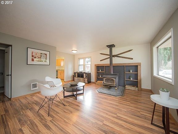 Adorable & cozy updated NE Portland Bungalow! Walk-in to a bright & welcoming living room, remodeled kitchen w/slab granite counters,under-mount sink & tile floors.Newer laminate "wood" flooring & fresh paint throughout main level.Beautiful wood burning stove with custom reclaimed mantle.Partially finished high ceiling basement.Large level fenced yard w/fire-pit & covered patio. Driveway w/RV parking potential