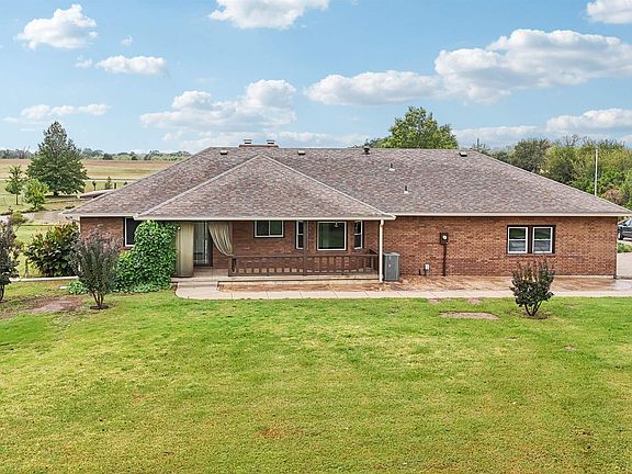 Enjoy peaceful views and modern comfort in this beautifully remodeled 5-bedroom, 3-bath home situated on 4.8 acres along a paved road in the Goddard School District. Relax or entertain on the spectacular, full-length composite deck overlooking a tranquil pond and natural landscaping filled with many trees including fruit trees. Inside, you'll find an open and inviting floor plan featuring granite countertops, all-new appliances and immaculate wood floors. The main floor includes a completely updated kitchen, dining room, utility room, a vaulted living room with wood burning fireplace, a bedroom and master bedroom with access to the expansive front deck, ample closet space and a remodeled bathroom including double sinks and a freestanding bathtub and tiled shower. The walk-out basement provides access to the lower patio and offers flexibility with a bonus room, a family room with brick fireplace and three bedrooms, one with its own kitchen and private bath - perfect for guests or extended family. The home has an oversized two-car garage with built-in shelving but also has a spacious 30 ft x 30 ft outbuilding for storage or workshop use with a concrete floor, heating unit and front and back 9-foot overhead doors with opener. An irrigation well provides water for outdoor use. This well-maintained home includes many additional updates including new windows throughout in 2018, water softener and roof 2022, HVAC system 2024 and hot water heater 2025. Sellers will not make repairs to the outbuilding.