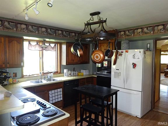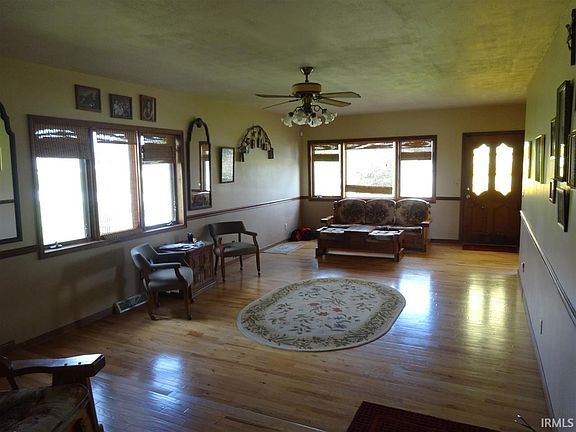 SPACIOUS 5 BEDROOM HOME ON 4 ACRES NEAR WINAMAC – Home has much to offer including newer roof, windows and hardwood floors throughout. Large living room, family room, rec room, eat-in kitchen with built in appliances and breakfast bar and full basement. Energy independence through newer solar and wind power and high efficiency geothermal heat/cooling system and wood furnace. Exterior includes textured concrete patio, great landscaping with mature trees, 2 detached garages, classic large barn, fenced rolling pastures and asphalt drive. Wonderful country views.