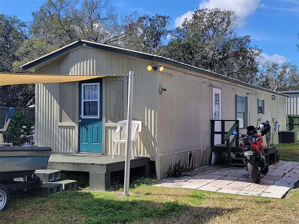1983 manufactured home on a large lot in west Lakeland - convenient to Lakeland Linder Airport, the Polk Parkway, and Interstate 4. This 783 square foot home has two bedrooms and two remodeled full baths. The primary bedroom has an en suite and a closet with sliding barn doors. The kitchen, dining space, and living area are an open floor plan to design how you'd like. The flooring throughout is an upgraded laminate and the metal roof was replaced in 2012. The air conditioning is approximately four years old and the electric was updated and buried - so no overhead power lines. The large lot has a large above-ground pool with wooden decking and a covered wood decked lanai to enjoy the beautiful Florida weather! There is also a shed with power for all of your toys and tools and a sail to park your vehicle under. Call today to see this home!