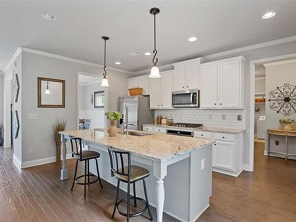 - Kitchen Features: Eat-in Kitchen, Pantry, View to Family Room, Kitchen Island, Solid Surface Counters, Cabinets White