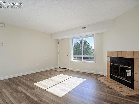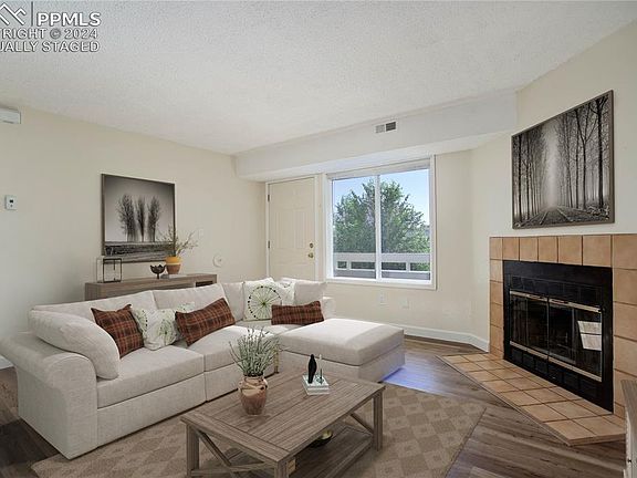 Move in ready two bedroom condo in gated Hunting Meadows! This upper level unit is on the east side of the complex, in one of the best locations overlooking the expansive green areas and bordering church property. This property features...large, sunny-south facing living room with new LVP floors, corner wood-burning FP…cozy eat-in kitchen with ample cabinet space, marble-look counters, and new range oven, hood and refrigerator…new carpet in both the 14x17 primary bedroom and 2nd bedroom...full hall bath with painted vanity and updated light fixture and faucet…laundry space for your full size washer and dryer...and large linen closet. Outside, you'll enjoy the...private deck with view of the mature trees...extra storage in the mechanical room...and assigned parking space. LOW HOA dues in comparison to other complexes, and easy access to both Academy Blvd. and Powers Blvd., too!