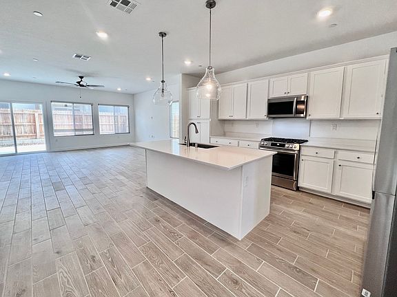 Front entrance opens to a living room, can be used as formal dinning, den, office, gaming, etc. Kitchen features an open floor plan leading to a second living featuring a ceiling fan. Sliding glass door access to backyard.