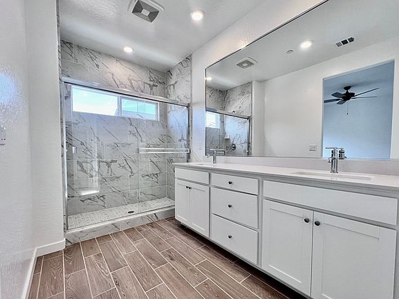 Large Primary bedroom features a spacious walk-in closet with built-in shelves, ceiling fan, and a beautiful full bathroom with quartz countertops, fully tiled walk-in shower, double sinks at vanity, and separate toilet room.