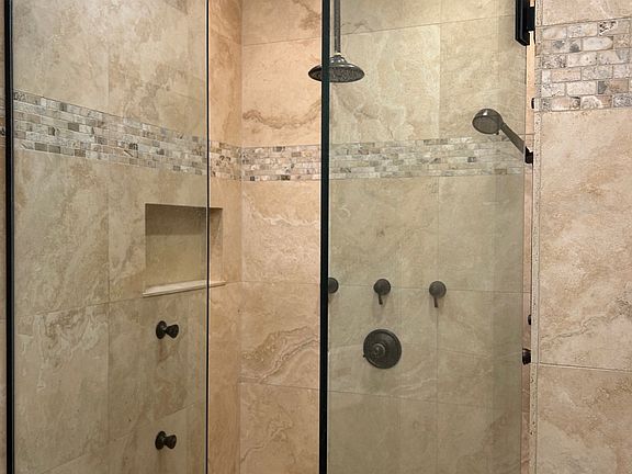 Chef's kitchen (JennAir, Wine Fridge, Disposal, Vented Hood) and travertine bathroom with heated floor.
