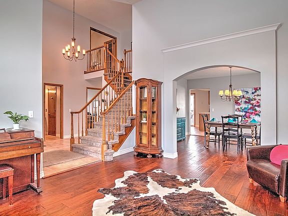 Extensive brick detail in the colonial tradition greets you to this very large, five bedroom home on a generous corner lot in Gatehouse. Considerable improvements throughout the home include hardwood flooring in the entry, hallways, living, dining and main level bedroom; newer stainless appliances in the kitchen including an Electrolux Gas Range; Remodeled master bath with raised vessel sinks, decorative tile around bath and separate shower and elongated floor tiles; elegant lighting, accent paint and window coverings. This one-of-a-kind home has a main level bedroom with large walk-in closet. Perfect for a main level office, it also has an attached 3/4 bath that makes a convenient guest room. The basement also has a large bedroom that is completely above grade and has a walk-in closet and nearby 3/4 bath. The entertaining possibilities continue with the custom wet bar; this raised oak bar has a generous wainscot detail and brass footrest to supplement the built-in raised cabinetry and wine racks. A large basement book shelf completes the bonus room office area. There is also a large, unfinished storage room. Upstairs are three bedrooms, each with an attached bath. The vaulted master bedroom has a ceiling fan, and a formal five-piece bath accessed via French Doors with a large walk-in closet at the rear. The two secondary bedrooms share a full bath in-between and have southerly and westerly mountain views. New Roof in June 2016, Newer Furnace and New Central Air. A highly functional, warmly lit home with an abundance of rooms, the house also enjoys great privacy on it's walkout corner lot. Situated in the eastern section of Gatehouse, the home is walkable / bike-able to all three levels of D20 schools as well as the Briargate YMCA.