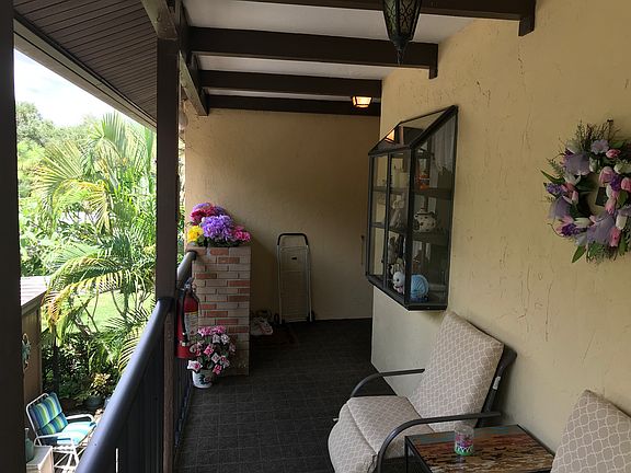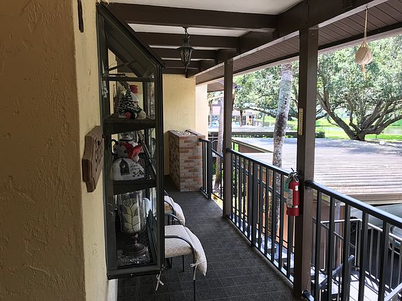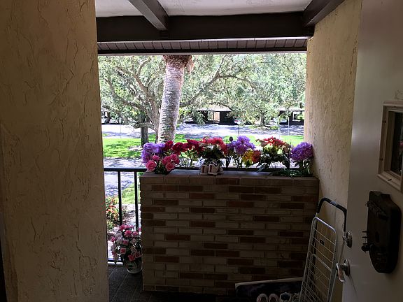 A rare find in this location for a condo this reasonably priced! Nestled in a park-like setting with oak trees and just 56 condos. Updated kitchen, newer appliances, A/C and water heater 2012. This split plan layout has two bedrooms (great for guests), two full baths, with an inside laundry closet and a nice sized lanai. The updated kitchen has a garden window and a pass-through to the dining area. The dining room has a buffet with cabinets for more storage. A spacious master bedroom with a walk-in closet with separate shower area and access to the lanai. The enclosed/screened lanai has storm shutters and the yard / tree view gives that feeling of privacy. The pool and clubhouse are next to this condo building. A carport and shed are included and condo fees include outside maintenance, roof, pest control, water, basic cable and WIFI.